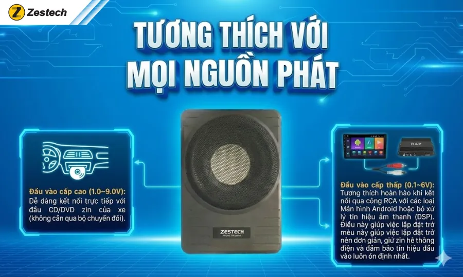 Màn hình Android Zestech có bộ xử lý âm thanh DSP rất tốt, nhưng nó chỉ xử lý tín hiệu. Để âm thanh thực sự hay, bạn vẫn cần một thiết bị phần cứng để phát ra dải âm trầm đó. Vì vậy, sự kết hợp giữa Màn Zestech + Loa Sub Zestech là combo hoàn hảo mang lại trải nghiệm giải trí đỉnh cao nhất.