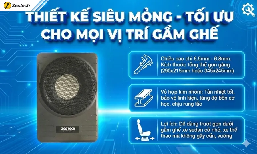 Sản phẩm tiêu biểu nhất hiện nay là Loa Sub Zestech Safe. Đây là dòng loa Sub điện (Active Subwoofer) được tích hợp sẵn Amply bên trong, được thiết kế chuyên biệt để đặt gọn gàng dưới gầm ghế, phù hợp với hầu hết các dòng xe sedan, SUV, hay bán tải.